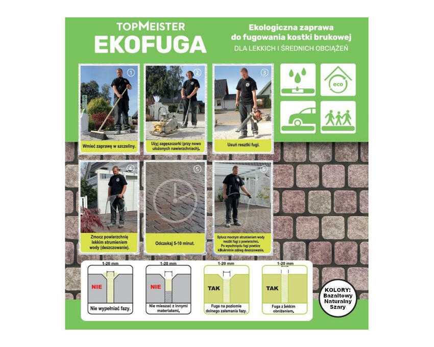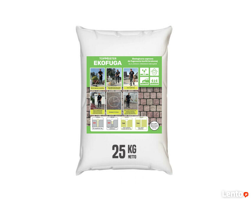 Ekofuga TopMeister jest jedyną na rynku fugą do stosowania „na sucho”. Oparta na opatentowanym spoiwie naturalnym Solid Green Binder. Szczególnie polecana do wąskich szczelin od 1 mm. Dostępna w trzech wariantach kolorystycznych: bazaltowym, naturalnym i szarym. Produkt oferowany w workach o wadze 25 kg.